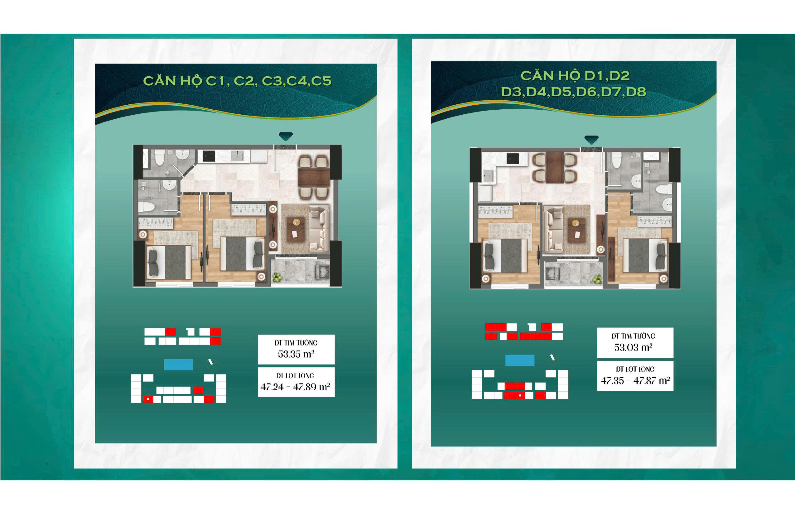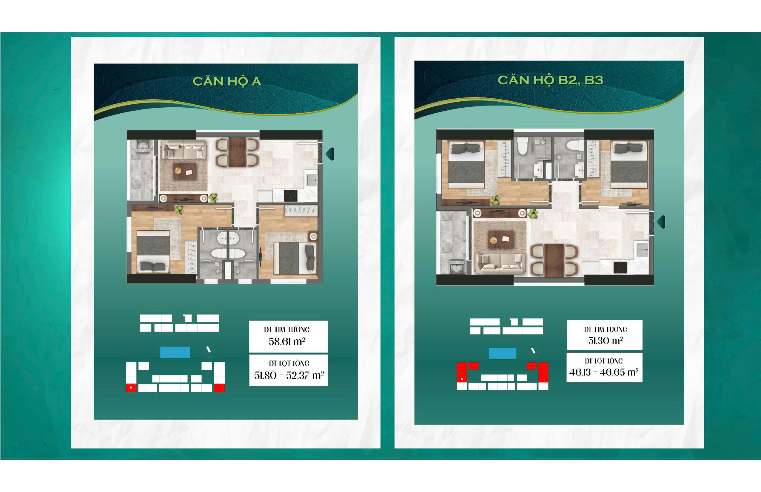 - Căn hộ 2PN: 52,36m2, 53m2, 54m2, 56m2.