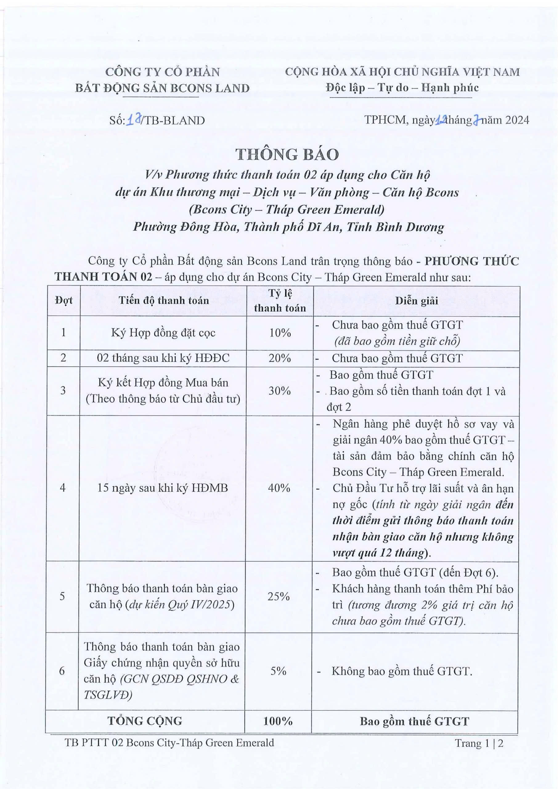 Bcons City tháp Green Emerald áp dụng 3 phương thức thanh toán cho khách hàng lựa chọn.