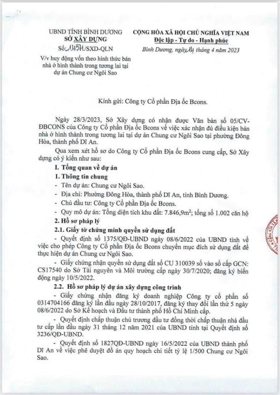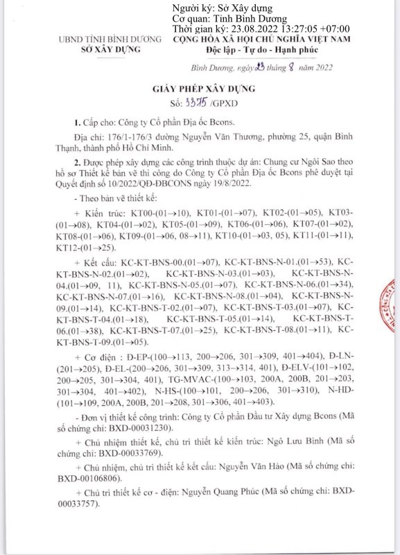 - Giấy phép xây dựng ( Dự án được cấp phép xây dựng số Giấy Phép Xây Dựng 3375/GPXD do Sở Xây Dựng tỉnh Bình Dương cấp ngày 23/08/2022