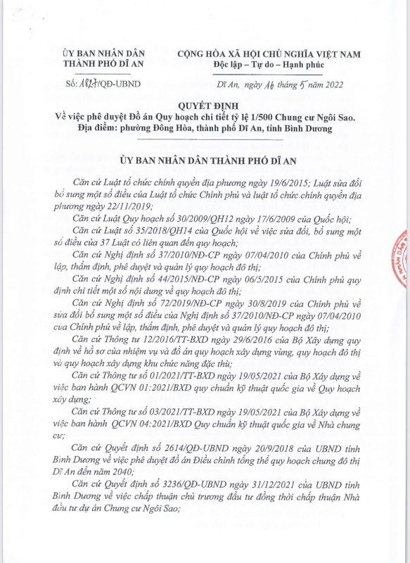 - Phê duyệt 1/500 ( QĐ phê duyệt quy hoạch 1/500 số 1827 ngày 16/05/2022 do UBND Thành phố Dĩ An cấp)