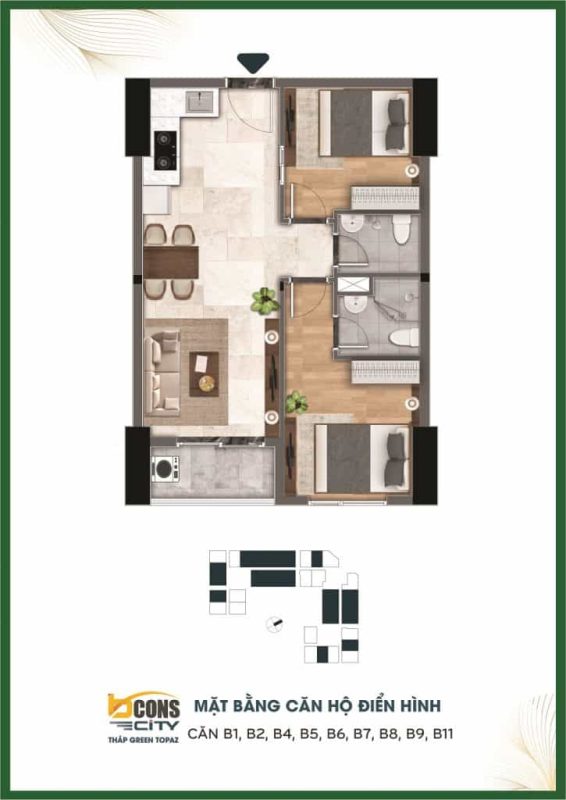 - Loại 2 PN – 2 WC: 58 – 63 m2