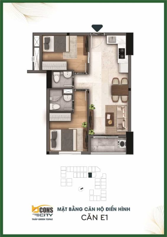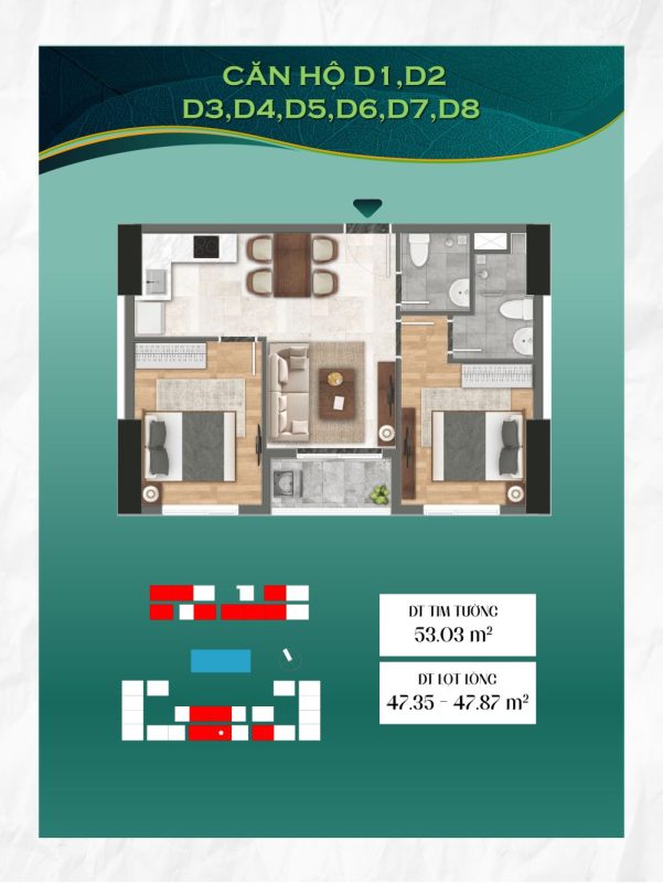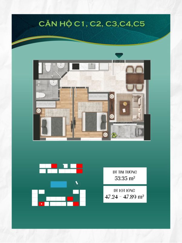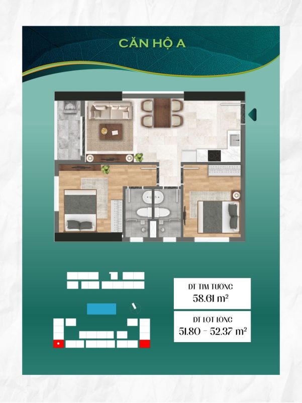 - Loại 2 PN – 2 WC: 51.3 – 55.98 m2