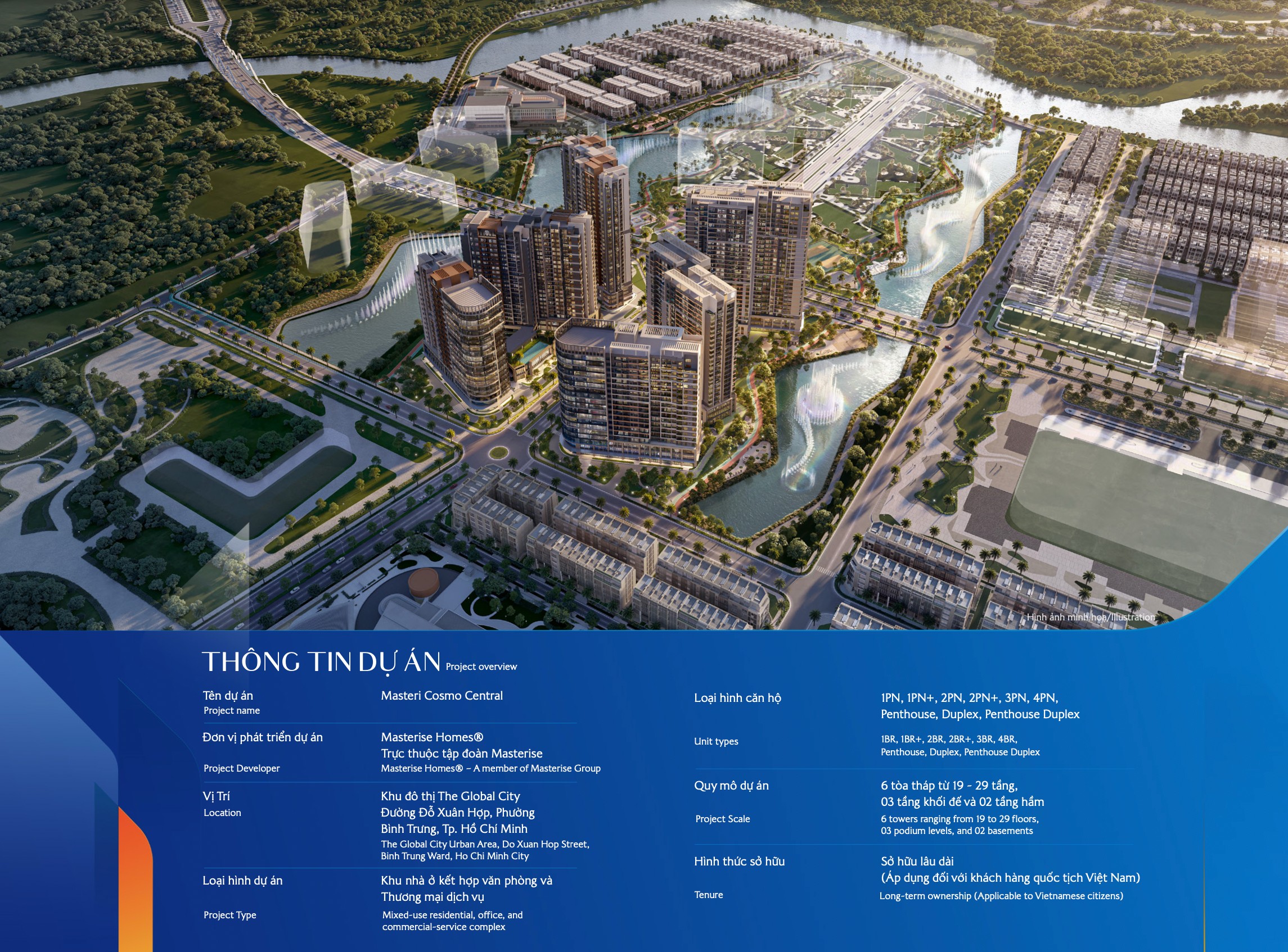 Masteri Cosmo Central tại The Global City có quy mô dự án: 6 toà tháp từ 19-29 tầng, 03 khối đế và 2 tầng hầm. Dự án bao gồm 9 loại hình căn hộ: 1BR, 1BR+, 2BR, 2BR+, 3BR, 4BR, Penthouse, Duplex, Penthouse Duple. Sau đây cùng Aqland cập nhật mặt bằng Masteri Cosmo Central (CT4) tại The Global City mới ra mắt.