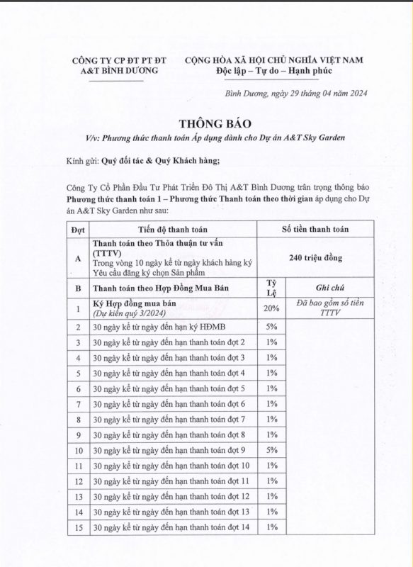 Tiến độ thanh toán AT Sky Garden