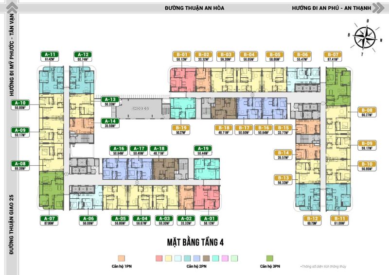 Mặt bằng Ben Hill Thuận An được thiết kế 2 Block đối diện nhau, và có khoảng trống giữa 2 block thông thoáng, giúp căn hộ dễ dàng lấy ánh sáng và gió. Giữa 2 block căn hộ là khu tiện ích giành riêng cho cư dân: Hồ bơi, công viên, khu vui chơi, đường dạo bộ,…