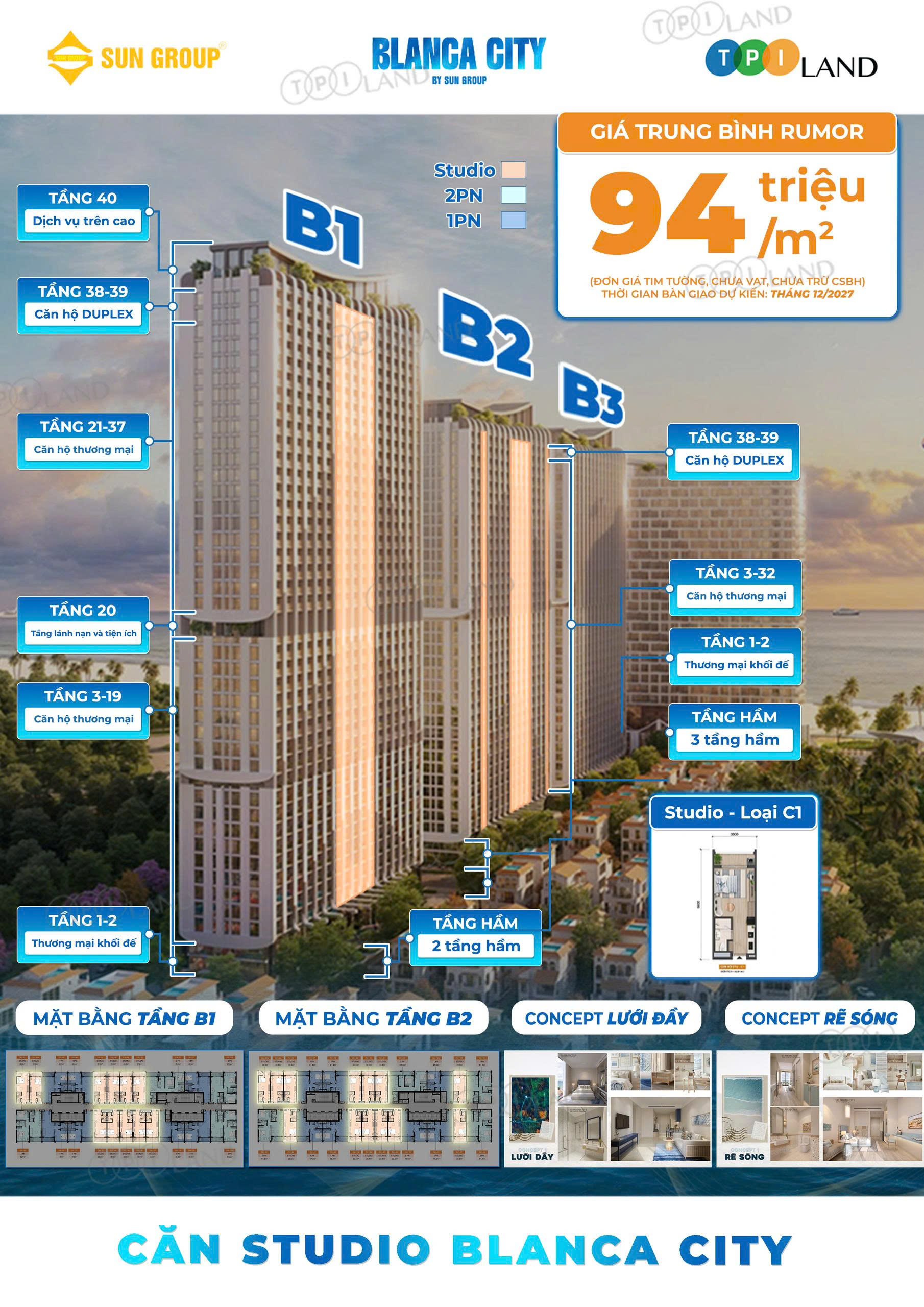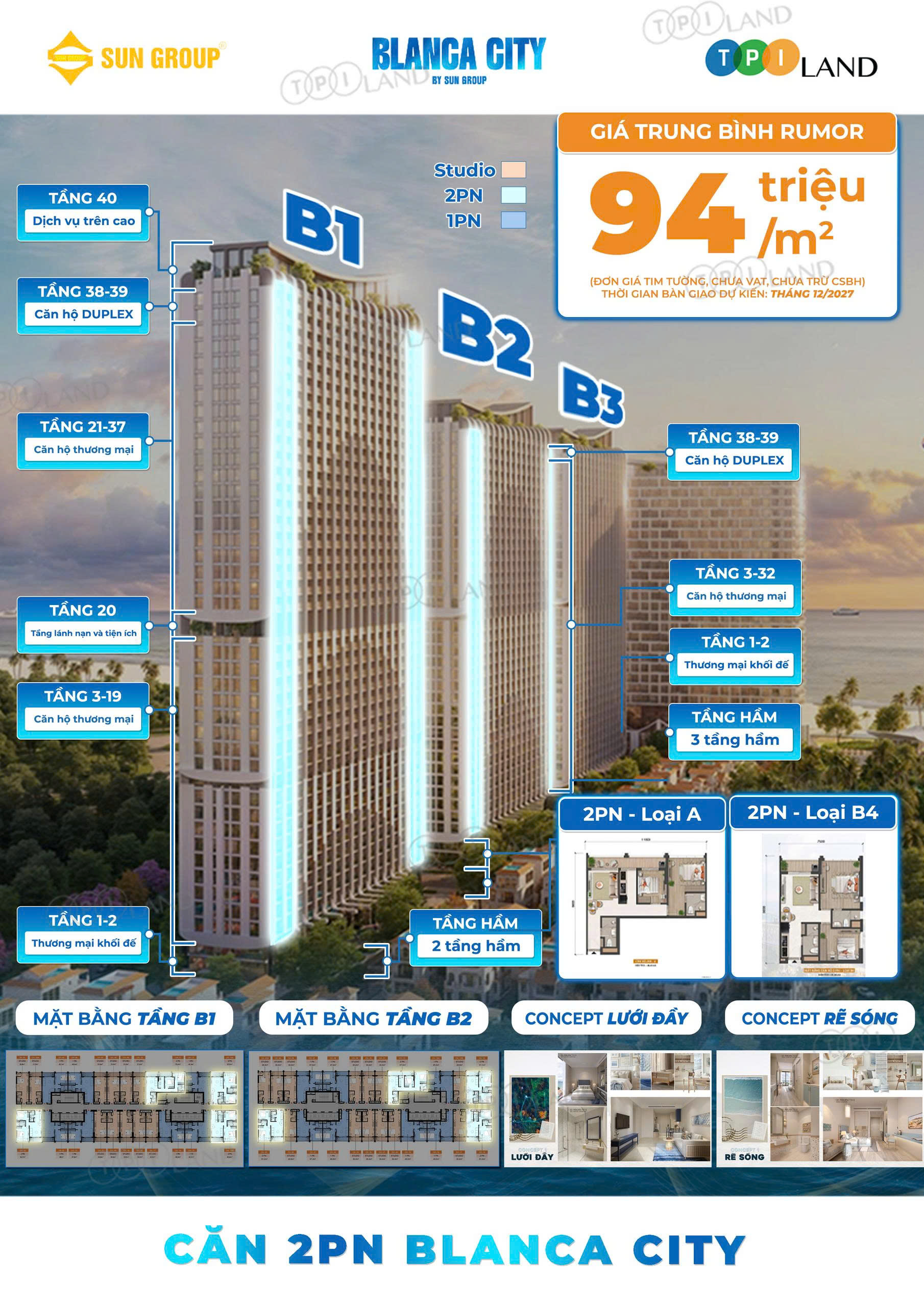 Ngày 25/6/2025, chủ đầu tư Sun Group chính thức công bố giá bán căn hộ Blanca Tower (Block Condotel sát biển) từ 75 triệu/m2 – 110 triệu/m2 (Trung bình 85 – 95 triệu/m2). Giá bán cao tầng Sun Blanca thay đổi tùy thuộc vào diện tích, tầng và view.