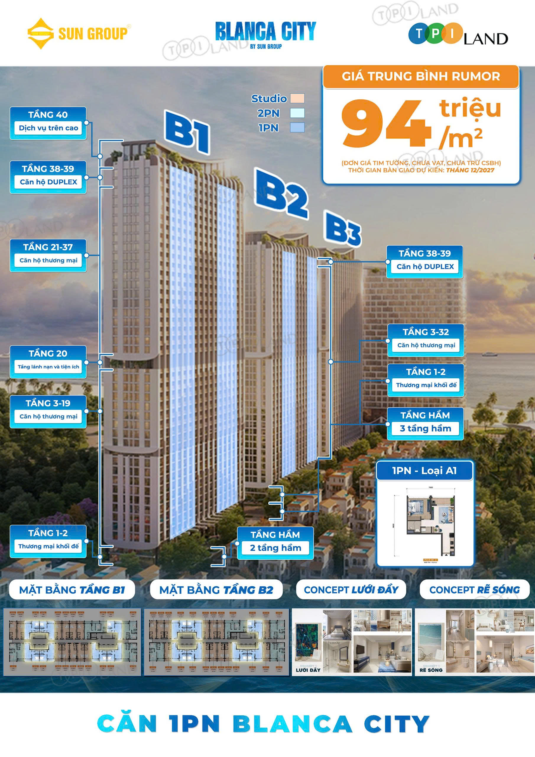Ngày 25/6/2025, chủ đầu tư Sun Group chính thức công bố giá bán căn hộ Blanca Tower (Block Condotel sát biển) từ 75 triệu/m2 – 110 triệu/m2 (Trung bình 85 – 95 triệu/m2). Giá bán cao tầng Sun Blanca thay đổi tùy thuộc vào diện tích, tầng và view.
