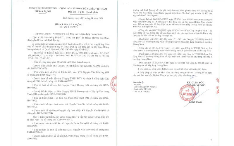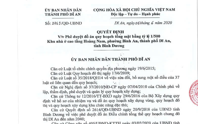 - Quyết định V/v phê duyệt đồ án quy hoạch tổng mặt bằng tỷ lệ 1/500 khu nhà ở cao tầng Hoàng Nam, phường Bình An, thành phố Dĩ An, tỉnh Bình Dương. UBND Thành Phố Dĩ An cấp ngày 05/06/2022.