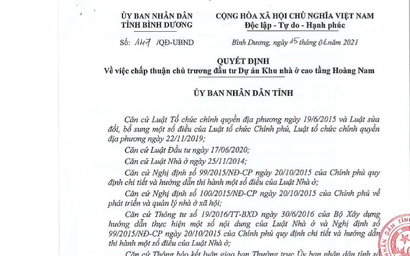 - Quyết định V/v chấp thuận chủ trương đầu tư dự án khu nhà ở cao tầng Hoàng Nam. UBND Tỉnh Bình Dương cấp ngày 15/01/2021.