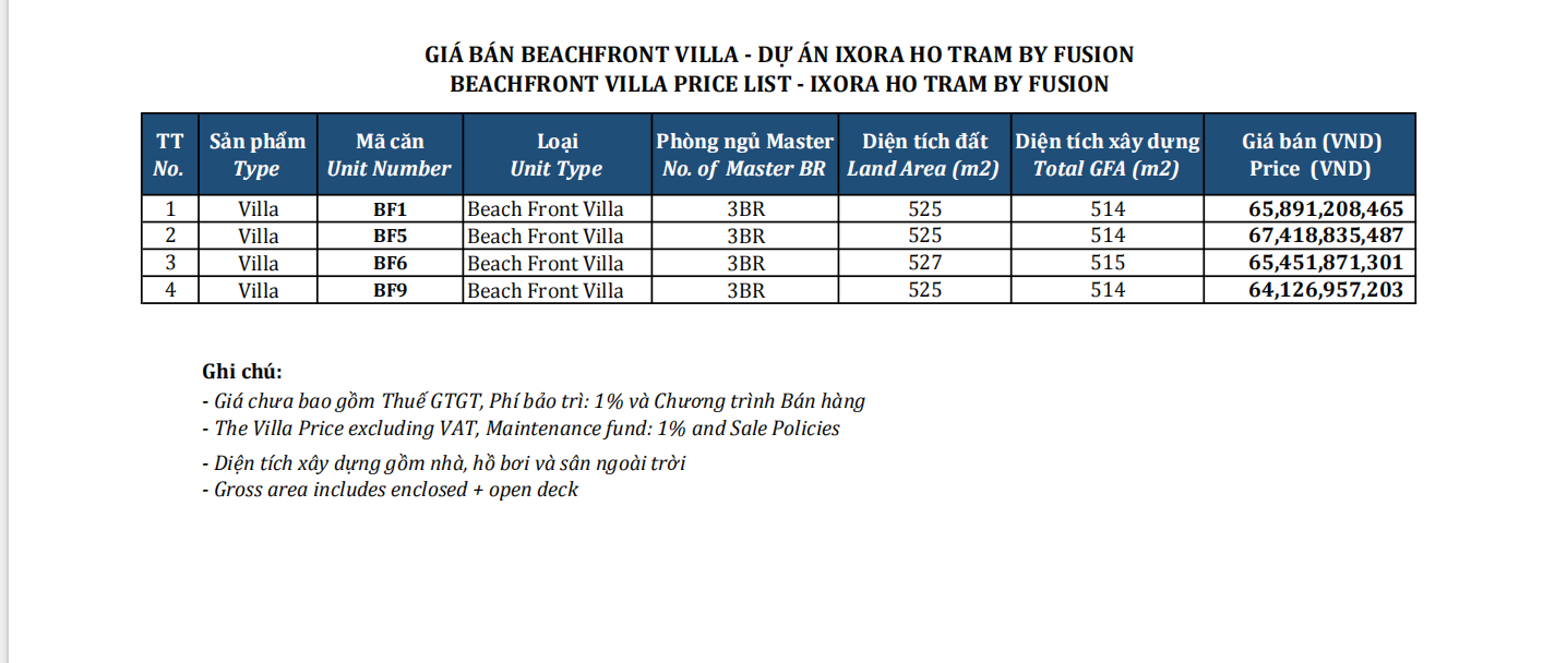 BẢNG GIÁ VILLA IXORA 2 HỒ TRÀM