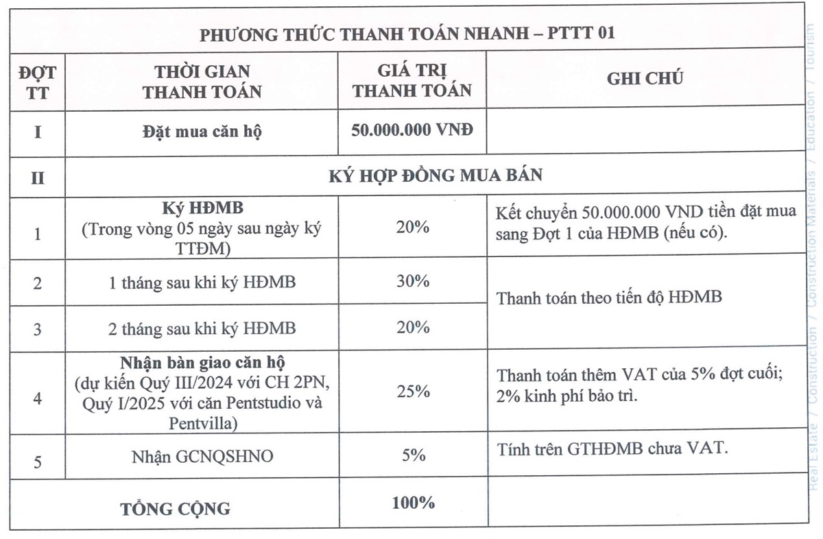 - Chiết khấu thanh toán nhanh: từ 5% – 15%.