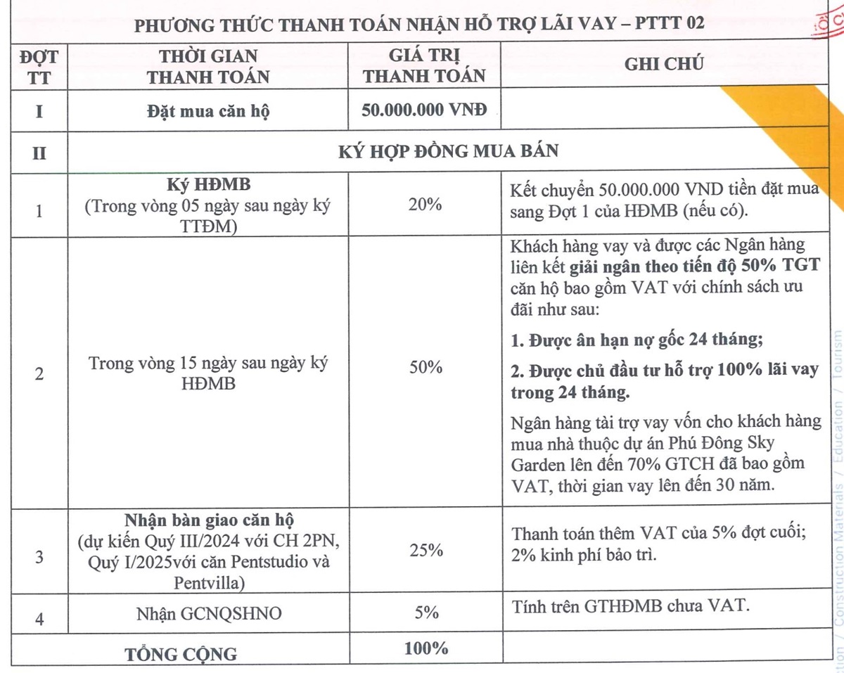 PHƯƠNG THỨC THANH TOÁN PHÚ ĐÔNG SKY GARDEN NĂM 2024