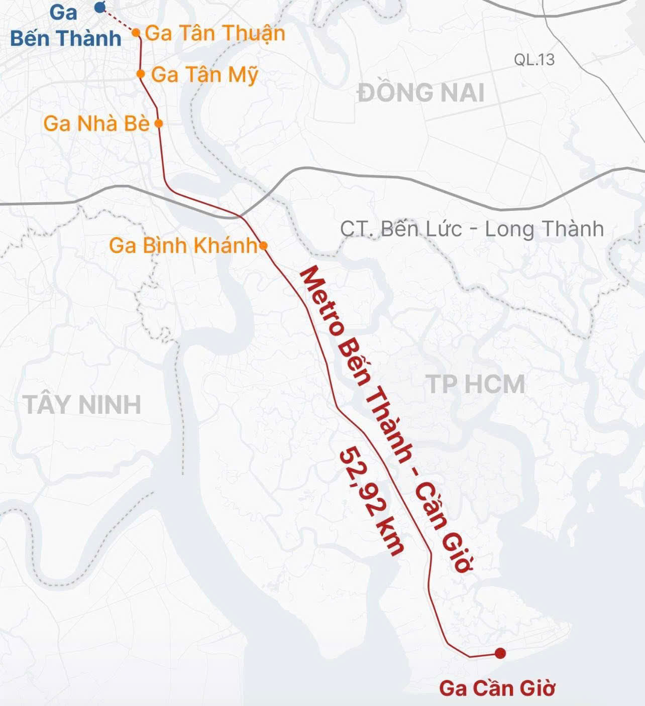 Tuyến metro có chiều dài gần 53 km, đi qua 8 xã, phường gồm: Bến Thành, Xóm Chiếu, Tân Thuận, Tân Mỹ, Nhà Bè, Bình Khánh, An Thới Đông và Cần Giờ (thuộc địa bàn quận 1, 4, 7, huyện Nhà Bè và huyện Cần Giờ trước đây).